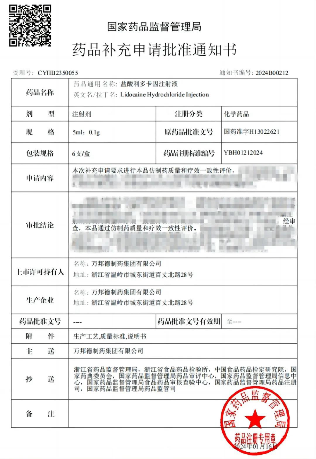 近日,万邦德制药集团有限公司收到国家药品监督管理局核准签发的关于盐酸利多卡因注射液(规格:5ml;0.1g)的《药品补充申请批准通知书》,公司申报的“盐酸利多卡因注射液(注册分类:化学药品)”经国家药品监督管理局审查,通过仿制药质量和疗效一致性评价。