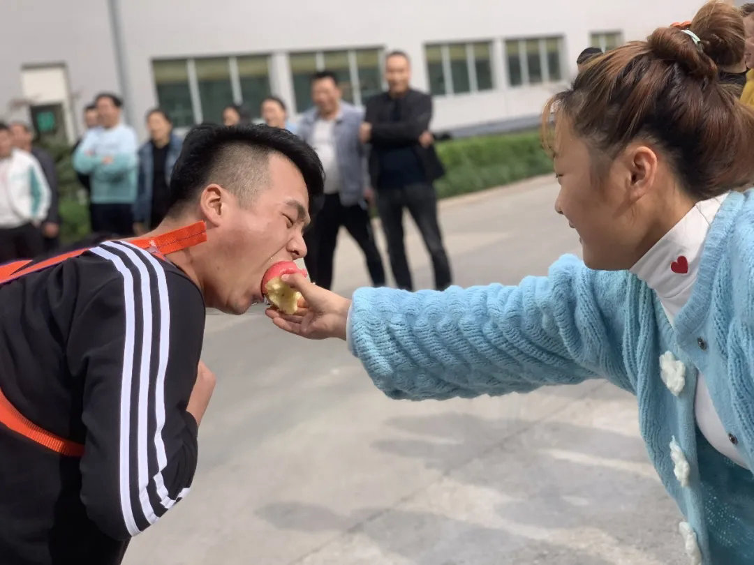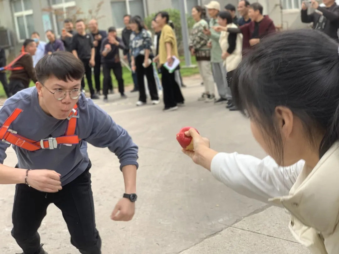 “预备~开始!”随着裁判一声哨响,参赛的男生们咬紧牙关、半蹲站立、降低重心、向前倾斜,使尽浑身解数往同组女生的方向移动。而同组的女生,站在划定区域边缘,尽可能地探出上半身,将手中的苹果递向同伴,以减轻同伴的负担,形成默契的配合。